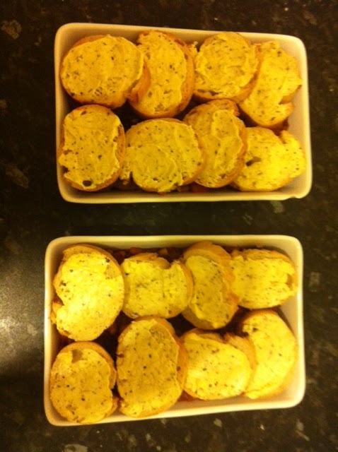 5. Once the casserole is cooked, split it between two individual sized oven dishes (or you can leave it as it is and add the garlic bread but it will be difficult to serve).